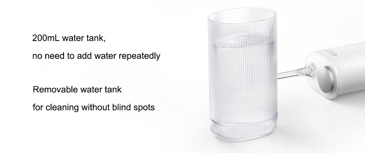 200mL water tank, no need for repeated refills. The water tank capacity is upgraded, increasing by 67% compared to the previous generation, enabling a full mouth clean with a single fill.